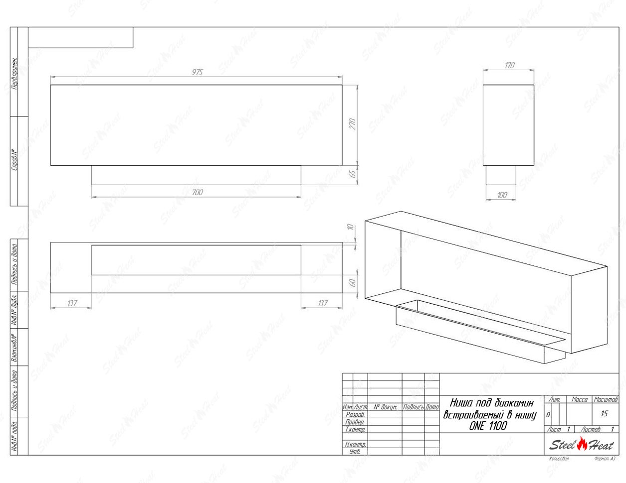Встраиваемый Биокамин SteelHeat One 1100 предназначен для встраивания в глухие ниши из гипсокартона, кирпича, пеноблоков, бетона.