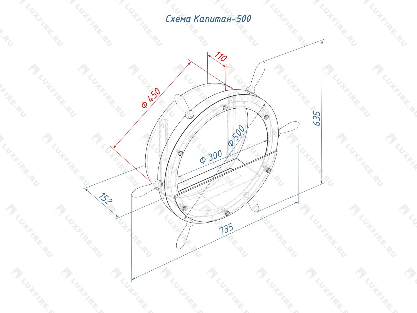 Представляет собой сборную металлическую конструкцию круглой формы класса XS в виде штурвала корабля , создающую полузакрытое безопасное пространство для огня с топливным блоком Lux Fire 250 XS ограниченную закаленным стеклом в котором горит живой огонь с углом обзора 180 градусов. Универсально подходит для встройки в нишу или подвеса на стену.